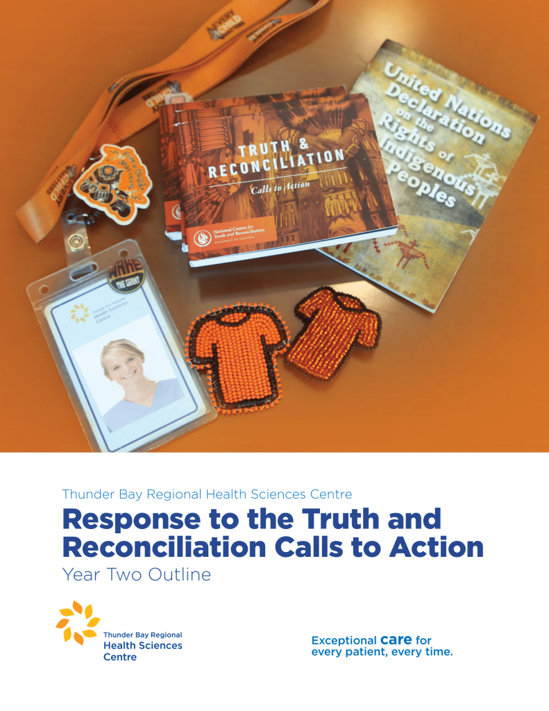 This report shows the work Thunder Bay Regional Health Sciences Centre (TBRHSC) has done to date through Strategic Plan 2026 and highlights our efforts to address the Truth and Reconciliation Commission’s 94 Calls to Action. TBRHSC will continue to apply the 94 Calls to Action as a lens to every decision we make as an institution, to ensure we deliver the highest level of compassion and inclusion to every patient, every time. The report focuses on the work that has been done at TBRHSC on five of the 94 Calls to Action (18, 20, 22, 23 and 24) related to health care. In addition, it highlights the work done through partnerships and a timeline of the Indigenous health initiatives to date.