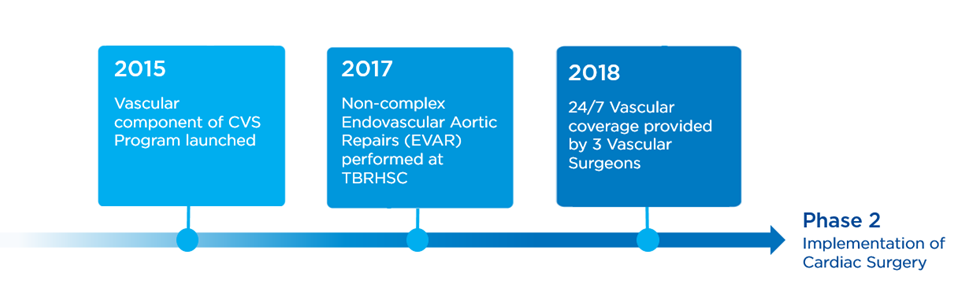 2017 The program successfully performed non-complex endovascular aortic repairs (EVAR) at the TBRHSC, marking a significant advancement in minimally invasive surgical options for patients with aortic diseases.